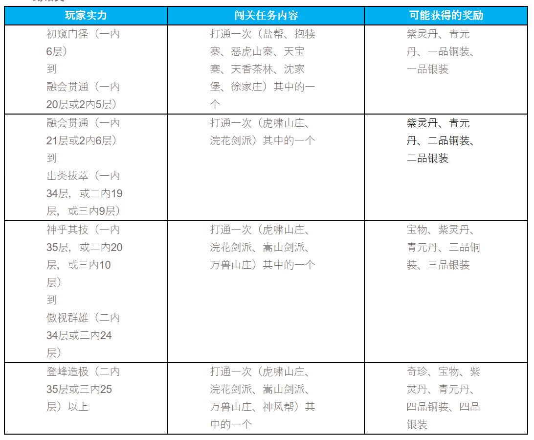攻略 【武林進階】俠客闖天關 13/11/2025 初入江湖沒實力沒銀子?不用着急,“俠客闖天關”帶你快速提升實力和裝備。 俠客闖天關系列挑戰任務 凡達到初窺門徑以上實力的大俠,可至蘇州裁縫徒弟卿寶(478 386)和謝曉(477 386)處與之交談,承接“俠客闖天關”挑戰任務,任務難度將與玩家實力相關,同樣難度越高獲得的獎勵也將更加豐厚、精良。 踢館類: 禁地類: