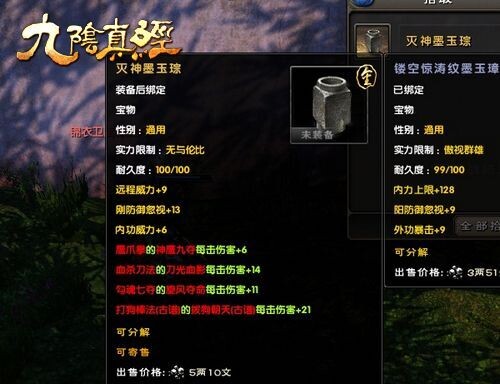 玩家可在人物屬性界面寶物分頁下看到裝備的寶物道具。 一個角色可以裝備多個寶物,每個角色可攜帶寶物數量隨所在服務器的九陰誌江湖進程而增加。寶物的佩戴沒有部位限製,但有實力要求限製,寶物裝備後綁定。