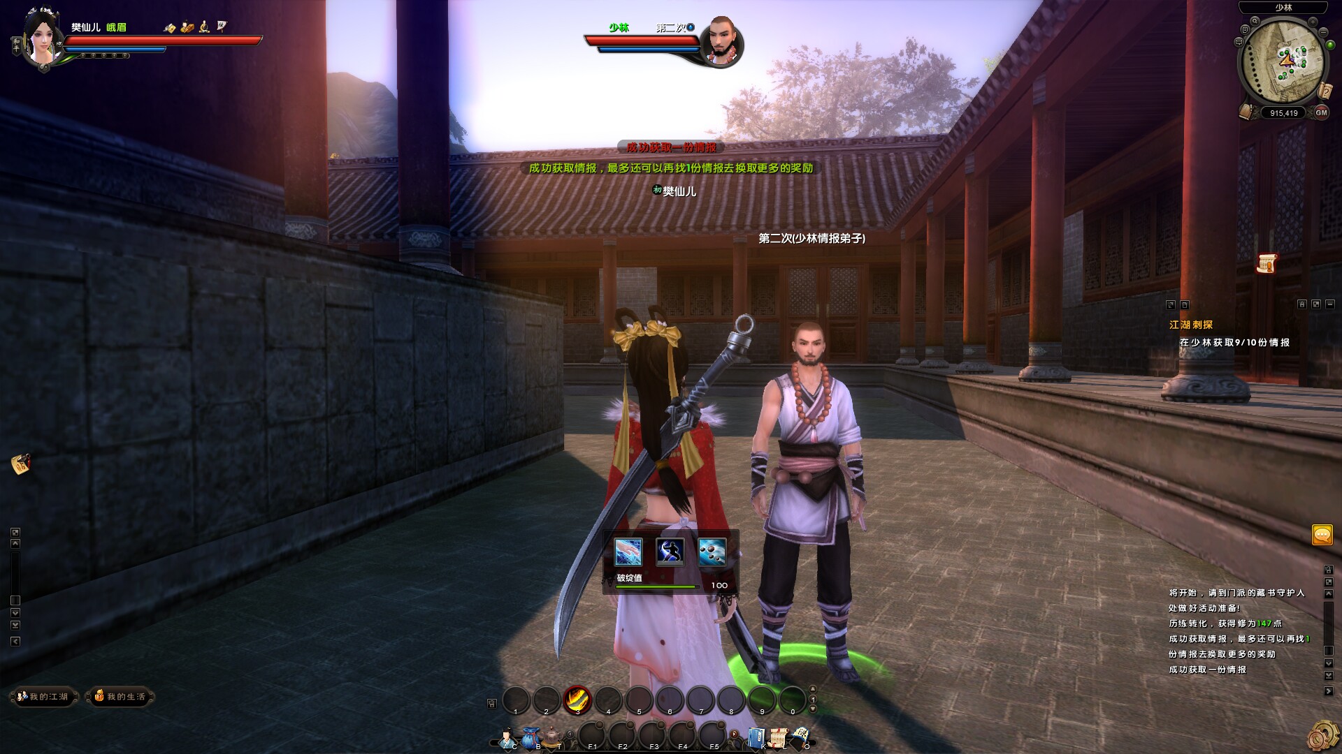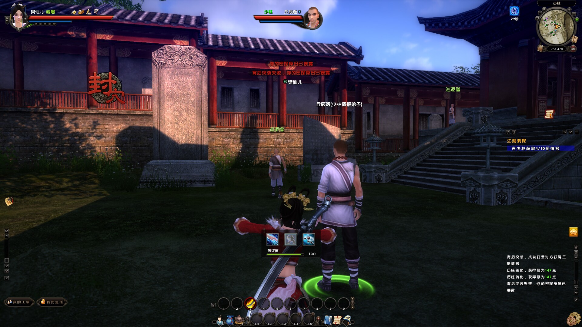 首先,在你參加門派刺探之後,你會被傳送至刺探門派地圖之內;其次,你會发現遊戲界面中間多了一個小框,分別是三個門派刺探技能與1個初始爲0的破綻值條。