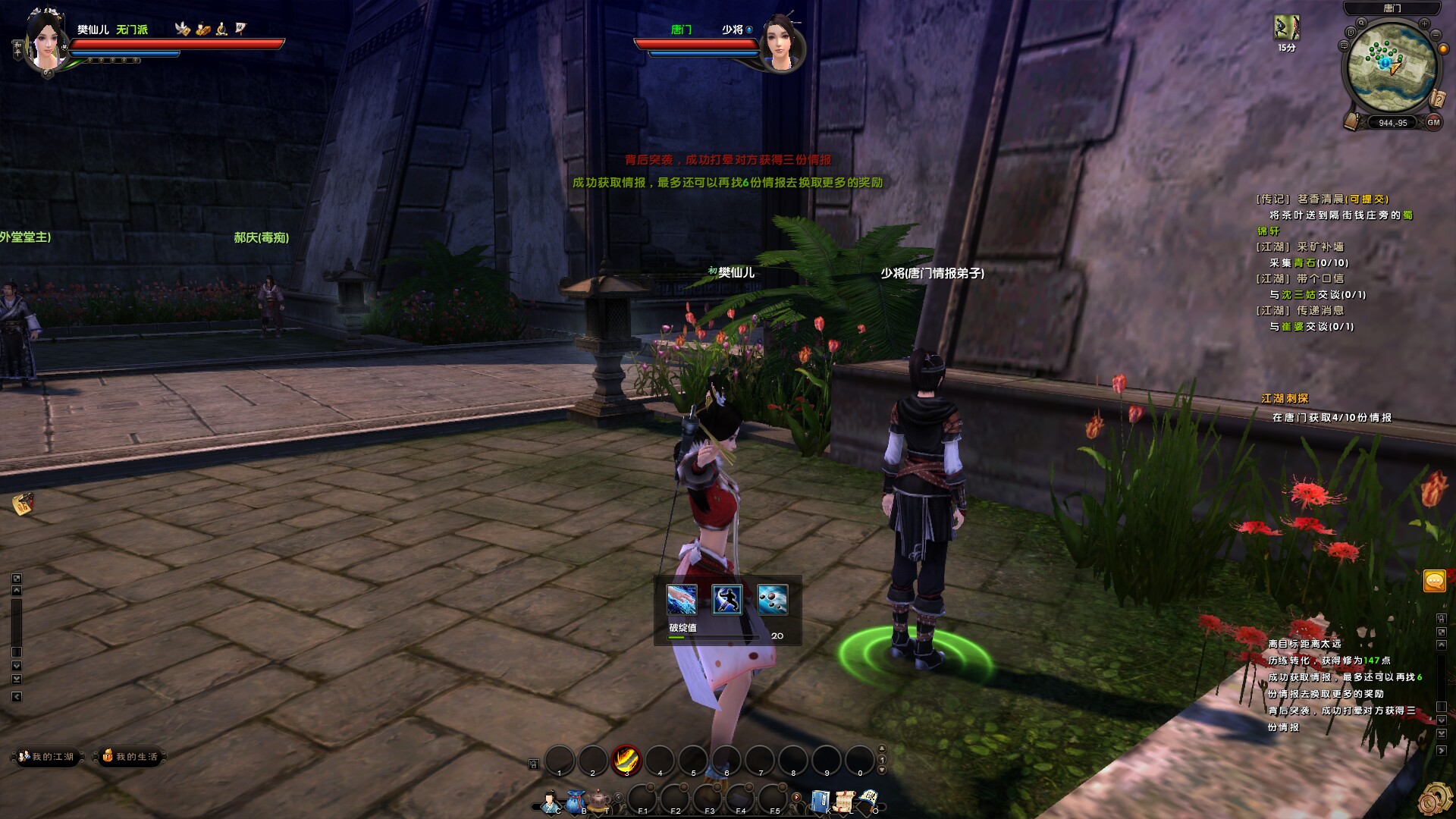 當成功獲得10份情報之後,你就可以回自己的門派交任務了,你可以通過“江湖爭鬥”框中選擇自己門派來查詢任務NPC的位置。