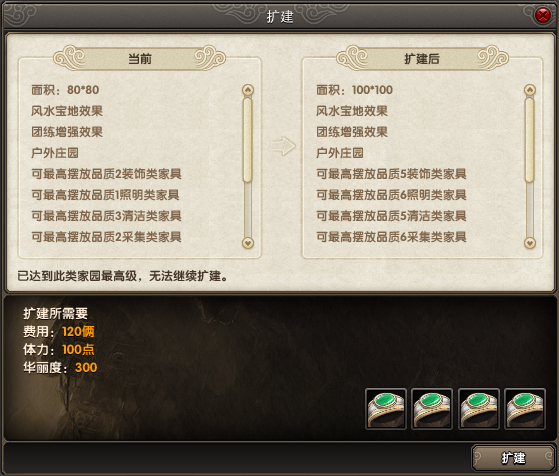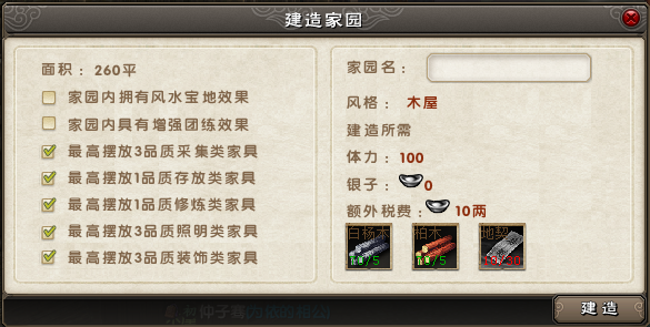 家園必須達到一定等級,才能擺放某些道具。獲得家具後,需要在背包內右擊,放入倉庫才能進行擺放,同時變爲綁定屬性。