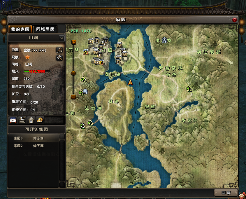 遊戲新增“我的家園”功能按鈕,打開後可以查看自己各家園信息、場景家園點分佈、家園好友等,並可進入家園。