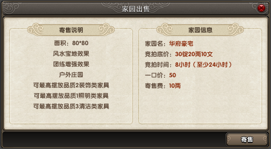 房主通過繳納少許寄售費,可以將家園上架出售。一旦處於寄售狀態的家園,內部家具將被鎖定,房主無法進行回收操作。