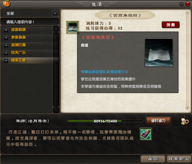 琴師可在平日彈練習琴的過程中吸取心得,當心得達到一定程度時即可獲得身份和稱號。