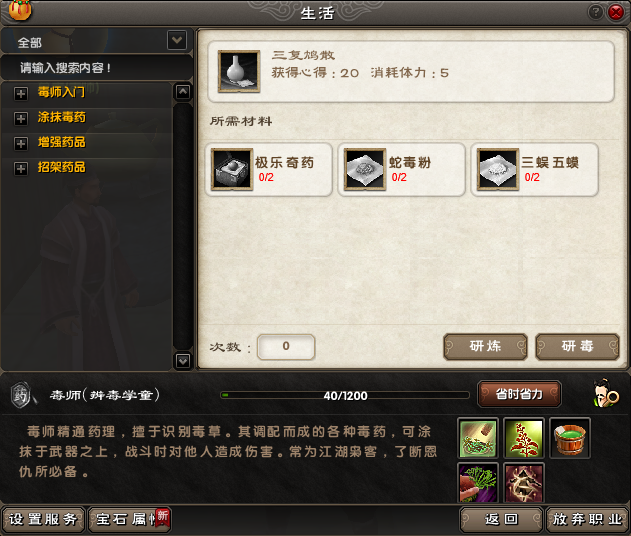 習得對應毒方,準備好材料之後,點擊研煉或者研毒,即可製作毒藥。