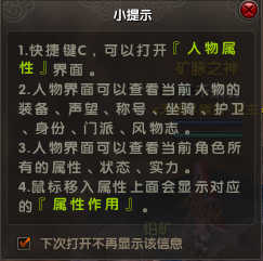 當初次使用某遊戲功能時,會彈出一個“小提示”,對該功能進行簡單介紹。關閉“小提示”後再想查看,可以點擊功能面板右上角小問號按鈕,“小提示”就會再度出現。