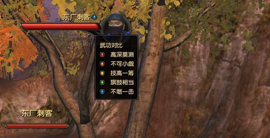 比方説,您現在看到身邊的野怪有點不爽,便可上前揍它一頓。但需要留意怪物與您的實力差距,選中目標後,在目標名字右邊有個彩色小圓點,鼠標置於上方就能看到您與目標的武功對比了。不同顏色代表您與目標之間不同的實力差距:紅色表示高深莫測,橙色表示不可小覷,黃色表示技高一籌,綠色表示旗鼓相當,藍色表示不堪一擊。當您與目標實力差距過大時,戰鬥需得小心謹慎才好。
