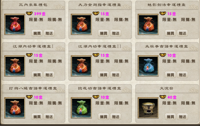 「古譜新運禮盒」系列以高價值古譜武學為核心,結合實用養成道具,讓玩家以親民方式,有機會獲得稀有古譜殘卷,加速實力成長。