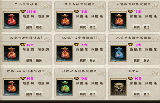 「古譜幸運禮盒」系列以高價值古譜武學為核心,結合實用養成道具,讓玩家以親民方式,有機會獲得稀有古譜殘卷,加速實力成長。